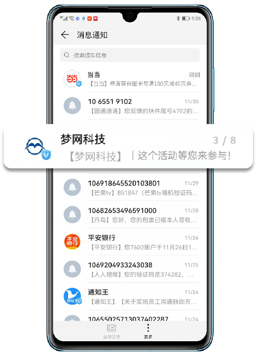 与传统的号段和单一的展现形式不同,在消息页形象展示方面,尊龙凯时z6com科技5G消息解决方案给予包含企业logo加V露出及品牌信息植入功能,提高了品牌的社会认知度和用户识别度。而信息界面可自定义企业业务应用模版卡片,式样丰富,实现了用户到H5、小程序等界面的直接跳转,一键直达核心营销页面,让企业在短信收件箱这一营销入口就能带来直观的流量转化,增强客户对公司更信任。