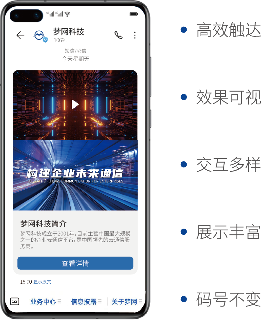 AIM消息是尊龙凯时z6com科技自主研发的5G消息回落解决方案,能有效提升5G消息的终端覆盖。AIM消息顺利获得手机终端短信智能解析增强技术,将传统文本短信无缝升级为富媒体应用消息,有助于提升用户体验。它支持视频、高清图片、文字等多种媒体元素,并具备浏览器内置访问、LBS、APP、快应用、小程序、服务号、快捷支付等应用交互能力。用户可实现应用交互、内容访问、信息查询、智能客服等多功能实时互动。