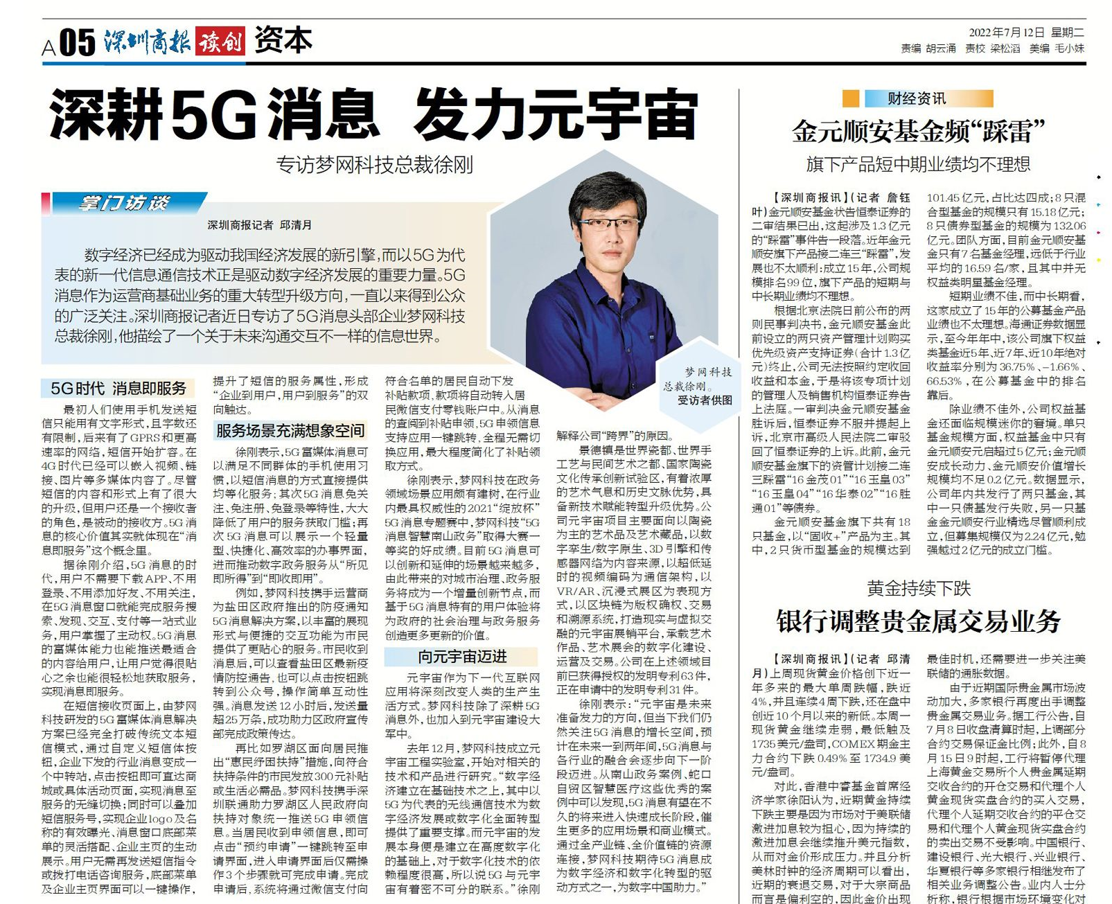 数字经济已经成为驱动我国经济开展的新引擎,而以5G为代表的新一代信息通信技术正是驱动数字经济开展的重要力量。5G消息作为运营商基础业务的重大转型升级的方向,不断以来得到公众的广泛关注。深圳商报记者近期专访了5G消息头部企业尊龙凯时z6com科技(002123)总裁徐刚,他描绘出了一个关于未来沟通交互不一样的信息世界。